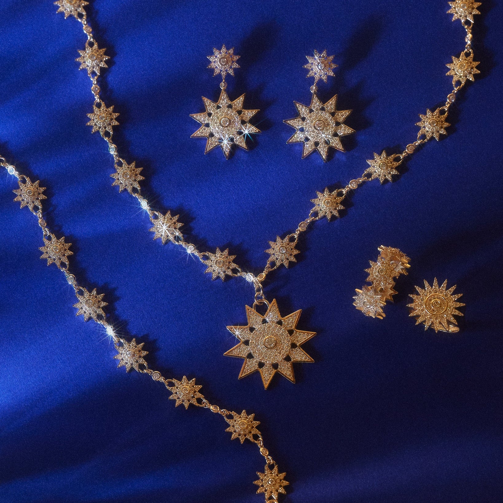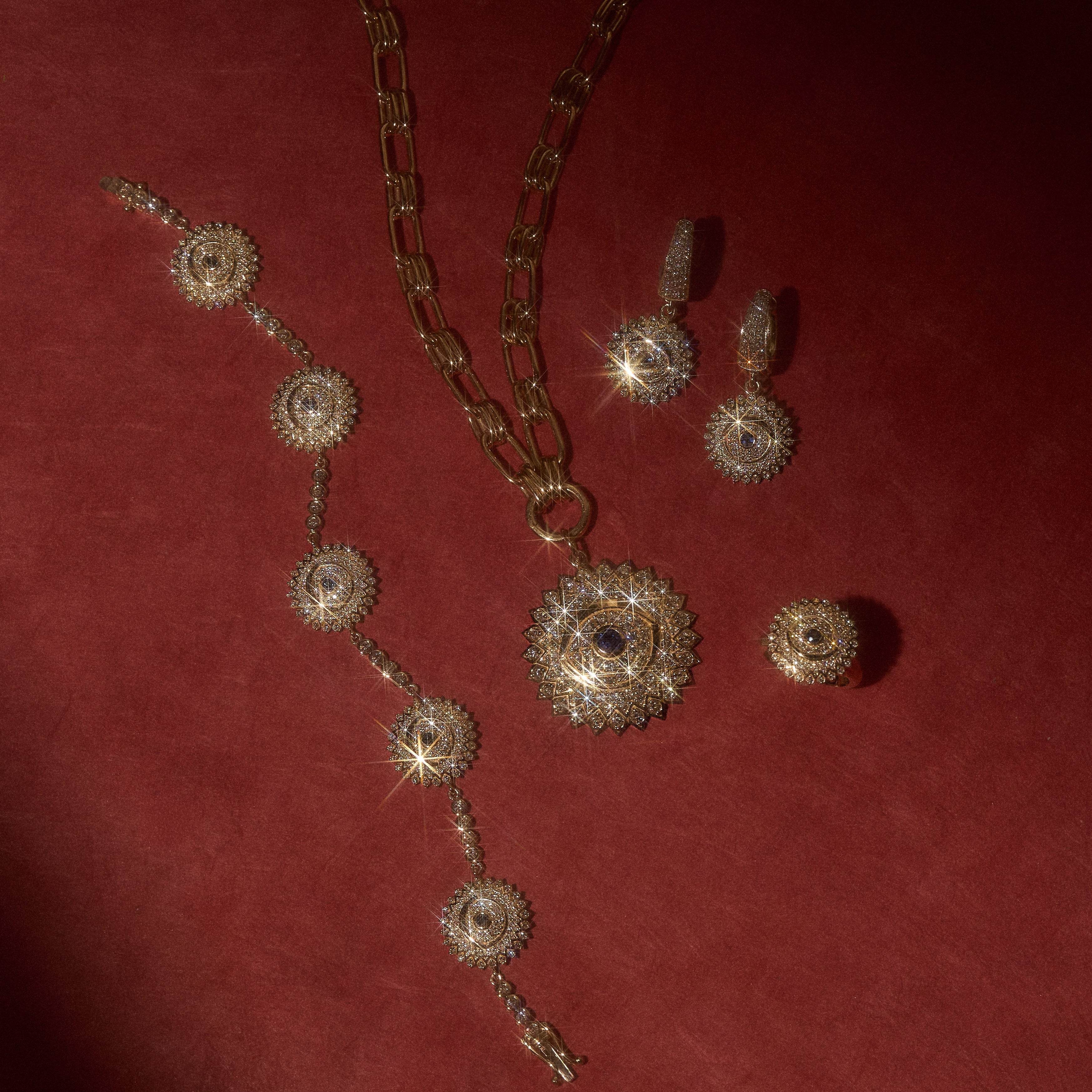 Aurelia, rooted in the opulence of the Byzantine Empire and reimagined through a modern lens, is our radiant homage to the beauty and grandeur of the ancient world. Designed with bold symmetry, concentric halos, and textural gold detailing, Aurelia carries echoes of a golden empire made wearable today. NamedAurelia, meaning “the golden one,” the collection captures a sense of sacred beauty and strength. It speaks to the woman who carries light, history, and power in every step.