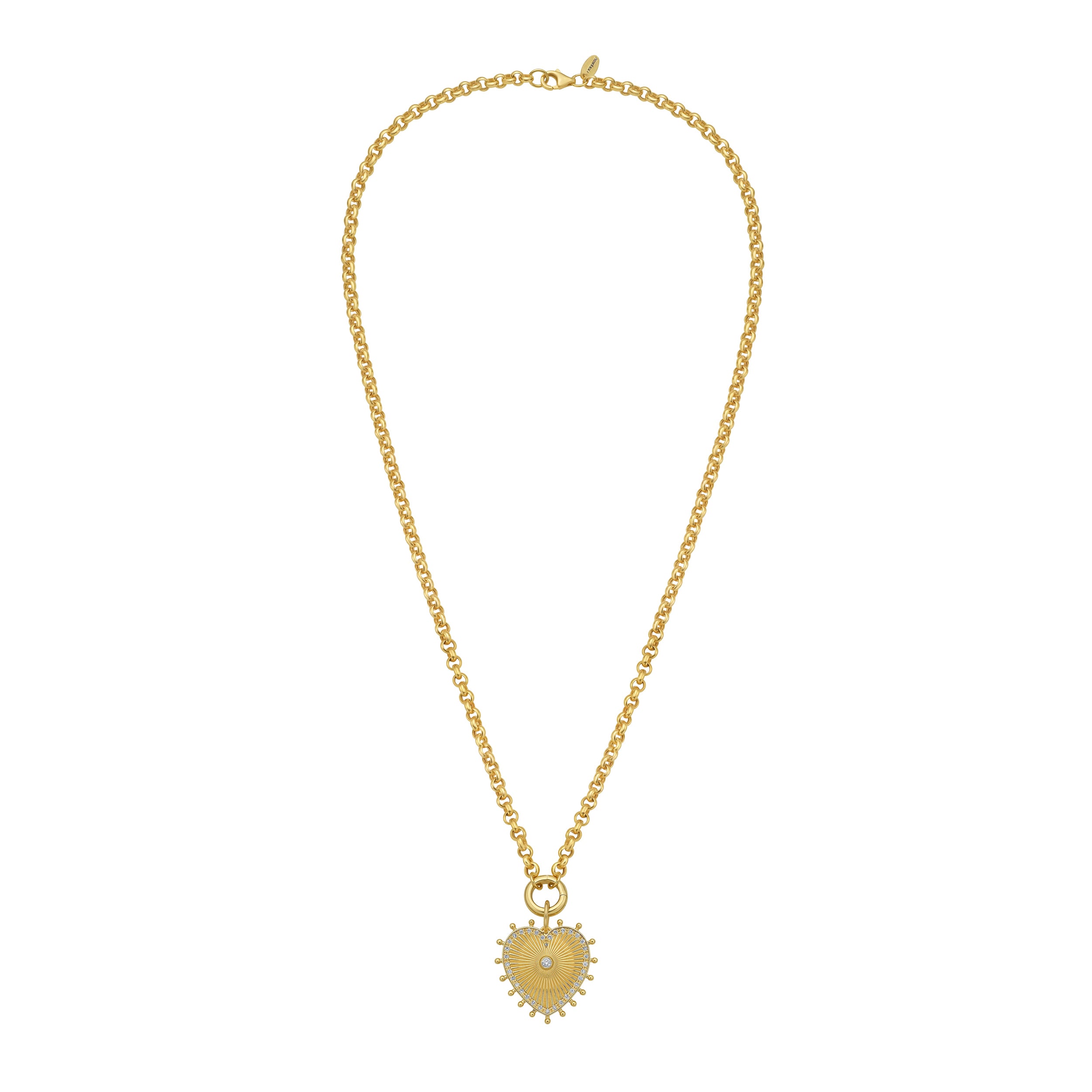 The Cassandane Heart Medallion effortlessly connects on a rolo link chain with a circular push-in connector, finished with a lobster clasp on the back, adding timeless elegance and versatile charm to your look.