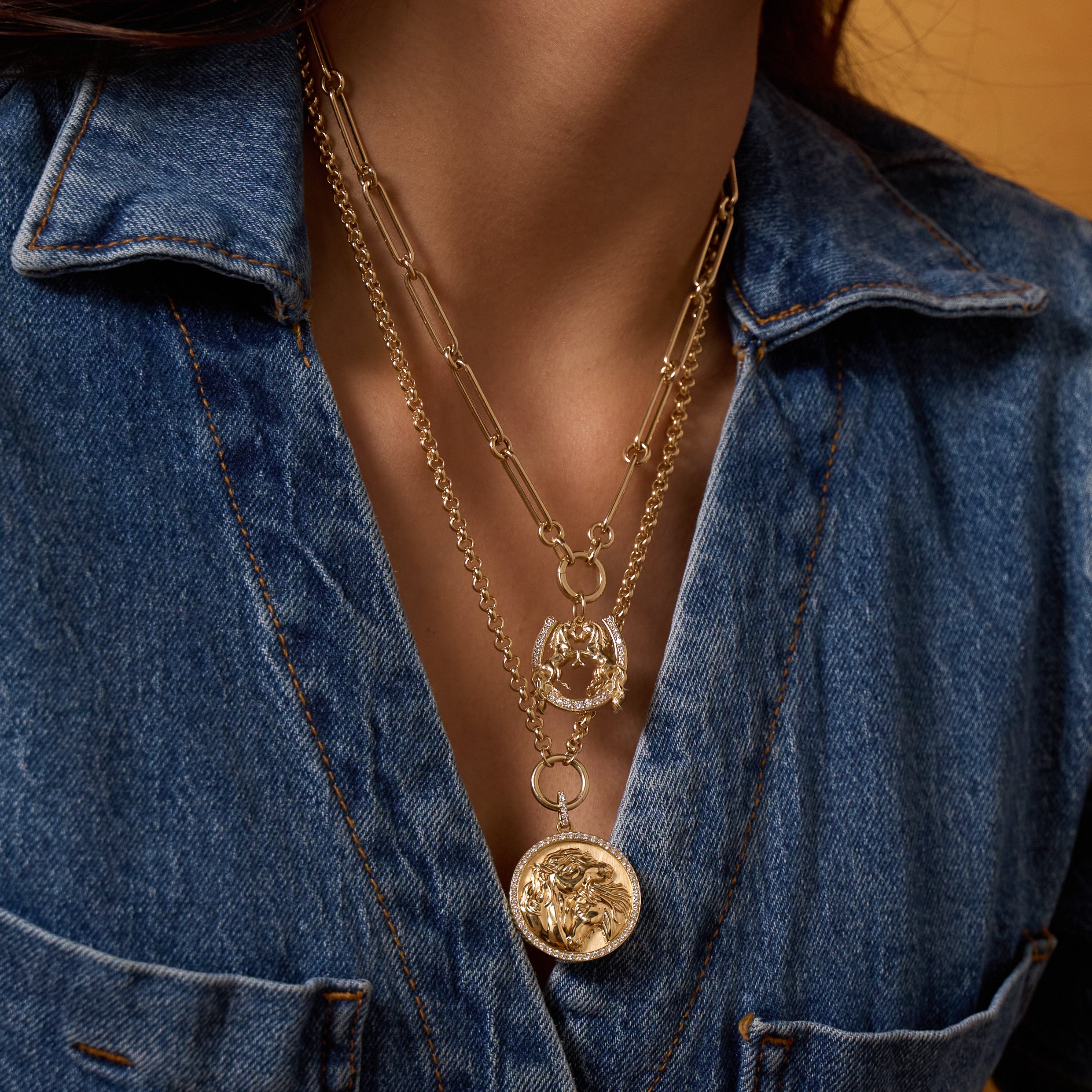 The Legacy Duo Horse Diamond Medallion captures a moment of quiet intimacy—two horses with their heads gently intertwined, symbolizing the enduring bonds that shape us. Whether it speaks to the love between parent and child, soulmates, or lifelong companions, this piece honors a connection that is instinctive, protective, and timeless.