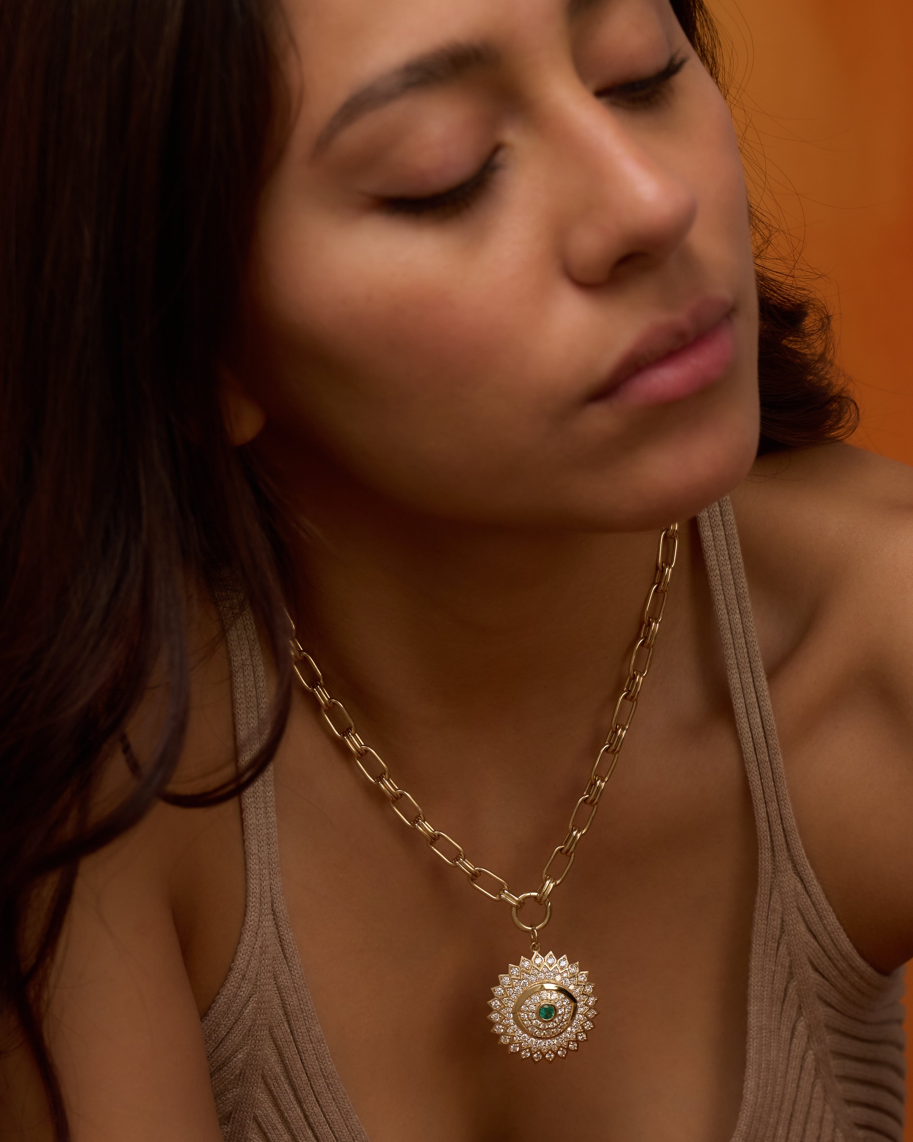 Lionheart Soraya emerald evil eye medallion in 14K gold with emerald center and full diamonds — protective talisman pendant