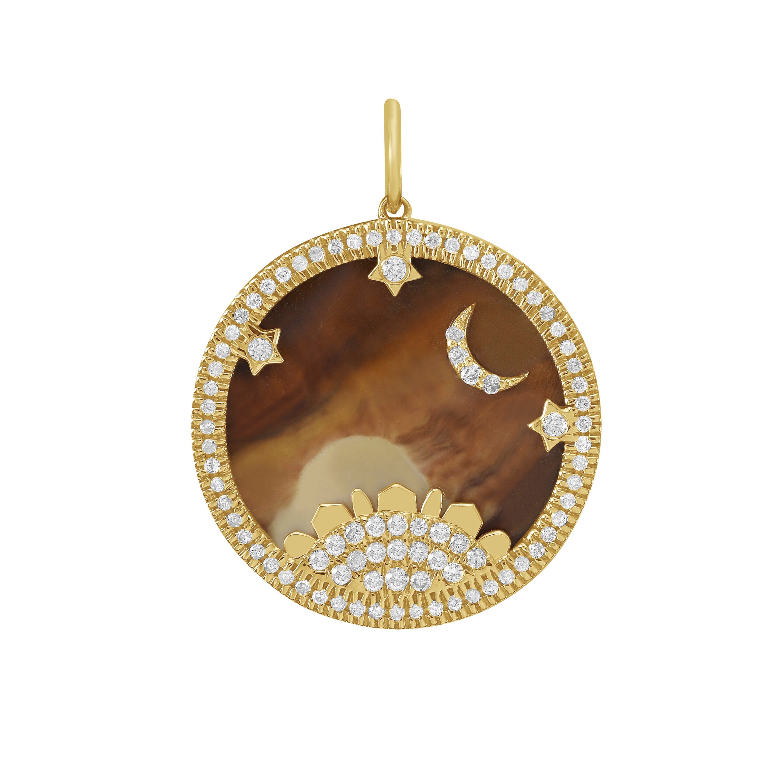 Our diamond Starry Night Charm with its beautiful brown mother of pearl backdrop and mountain design is a captivating accessory that marries the elegance of diamonds with the serene allure of mother of pearl. The gray mother of pearl shimmers like a starry night sky, while the diamond constellation is set against the backdrop of a stunning mountain range. This exquisite charm represents both the tranquility of nature and the enchantment of the night sky, making it a versatile and enchanting addition to any jewelry collection.