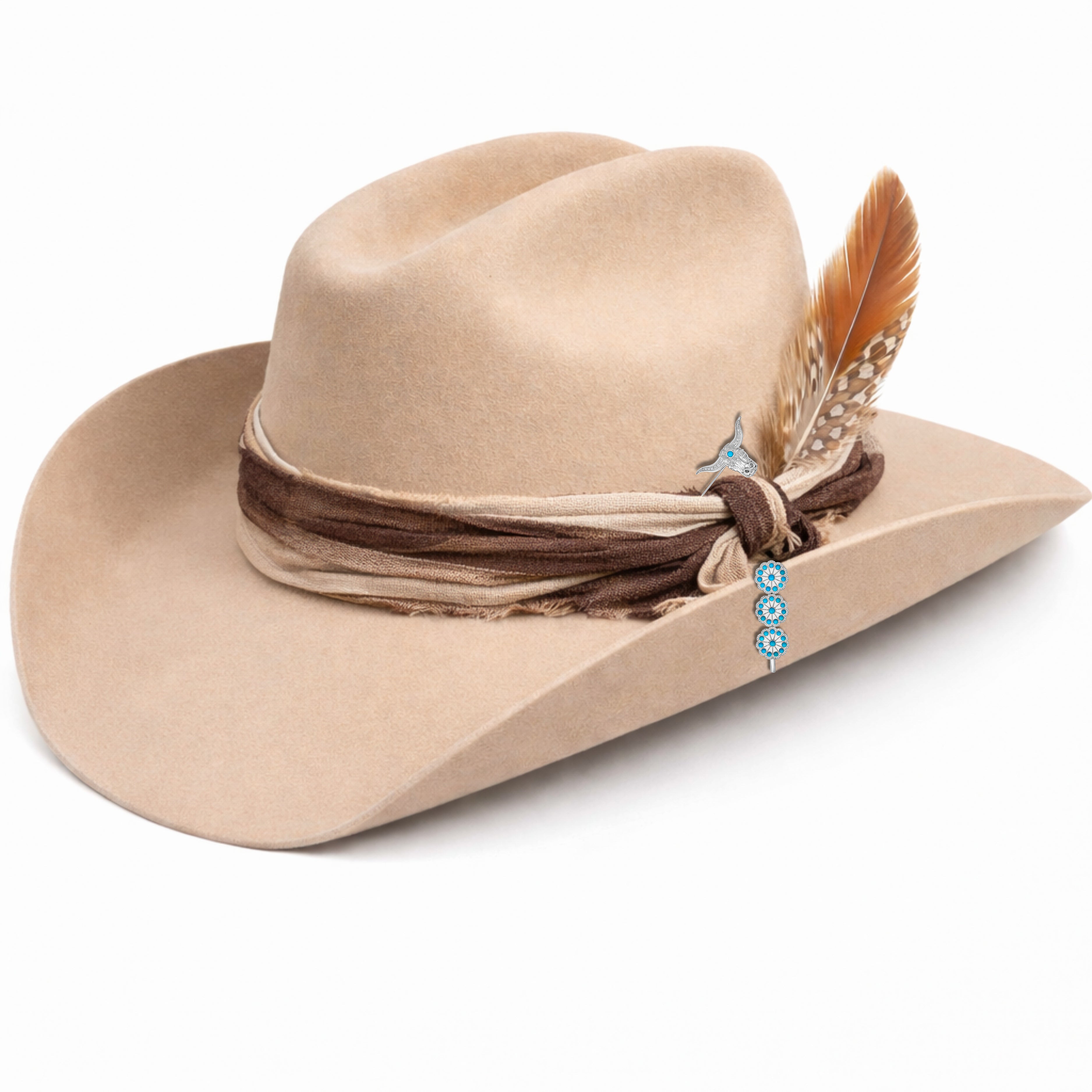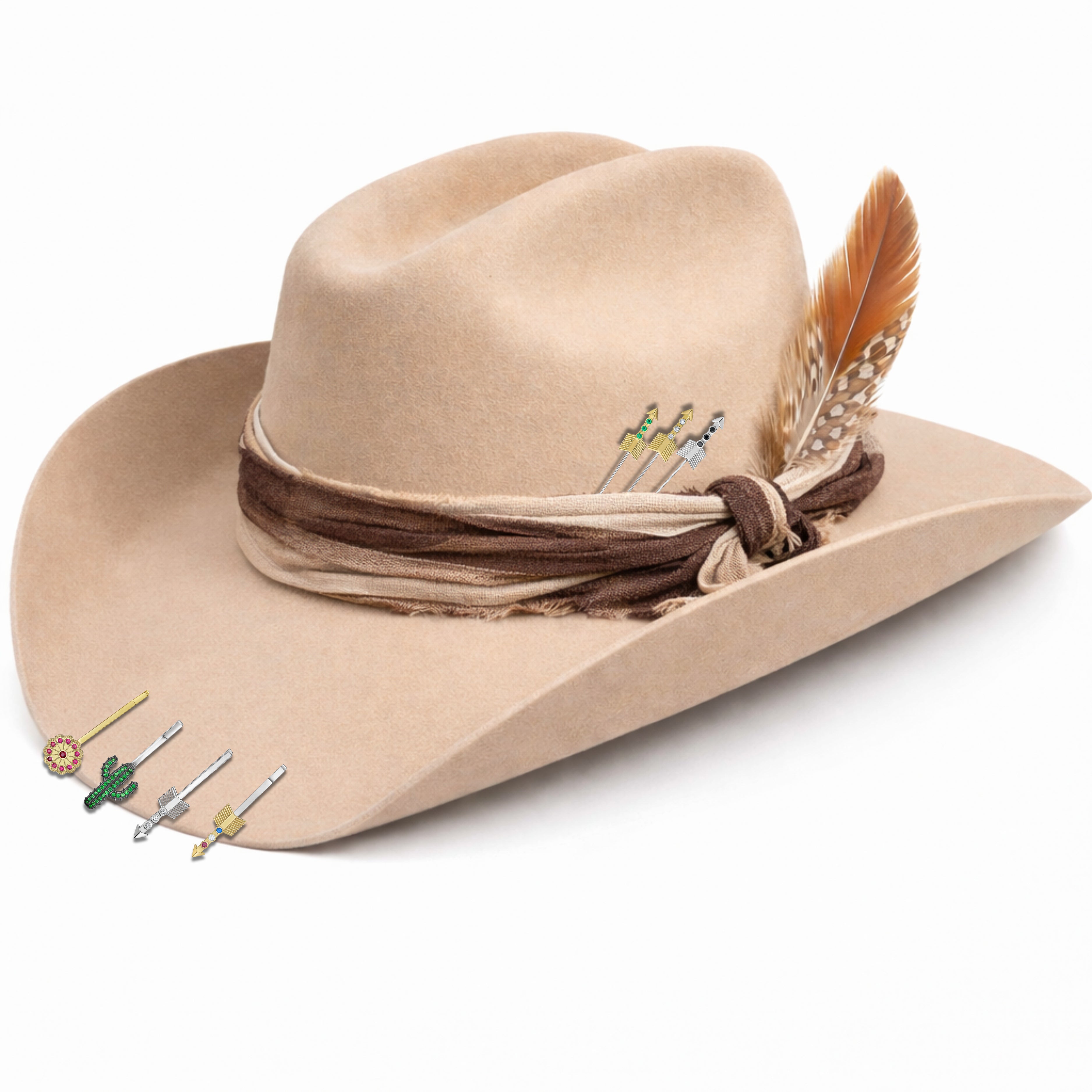 Hat Pins are designed to be placed directly into the fabric band that wraps around your cowboy hat. They add a decorative touch and subtle personality without altering the hat itself, making them simple to add, remove, and rearrange whenever you want to change your look.