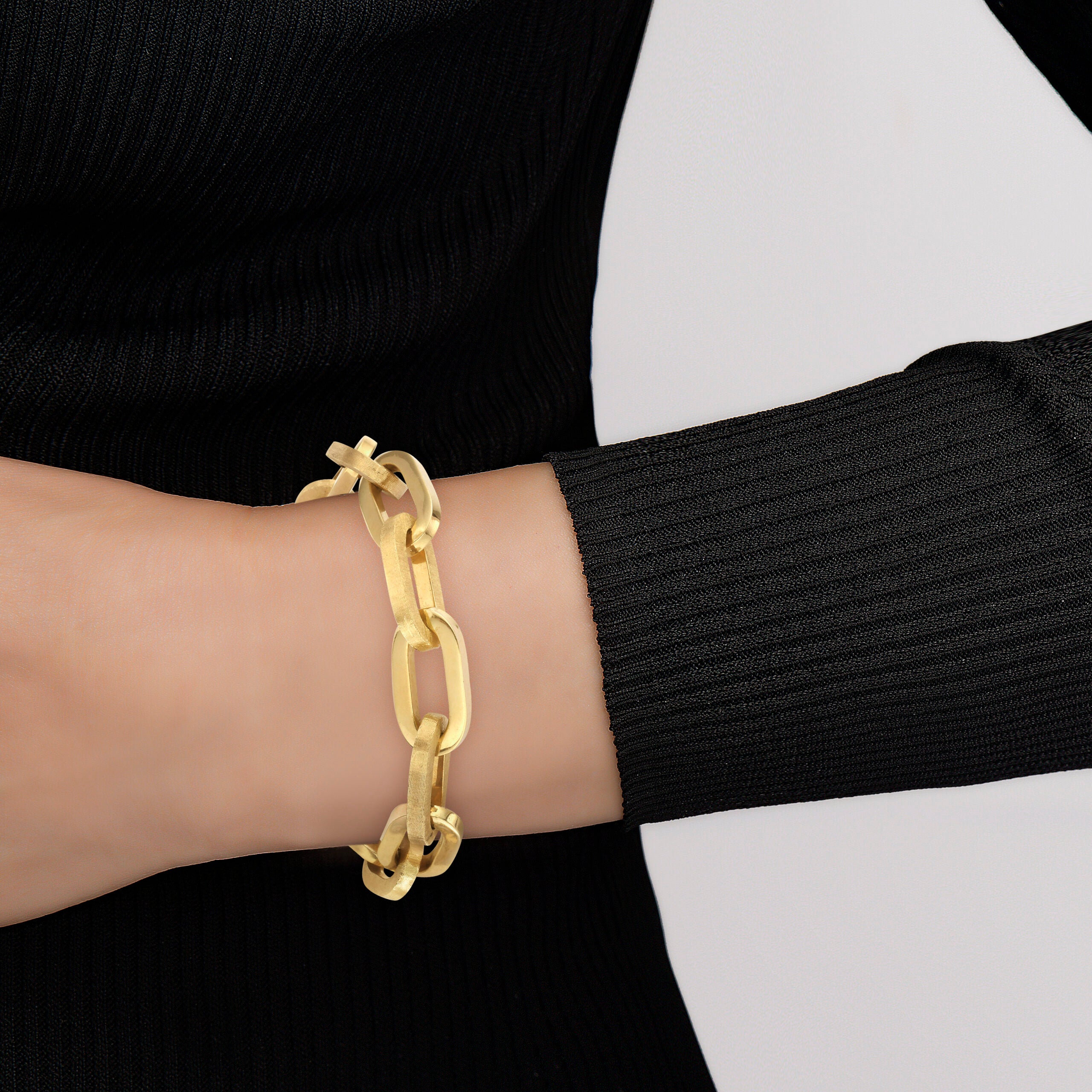 Discover our most requested Link Bracelet. Handcrafted in Italy with chunky, paperclip-inspired links, this timeless 14K gold piece is perfect for everyday wear. Effortlessly versatile, it looks just as striking worn solo as it does layered with your favorite bracelets — a true statement in gold.