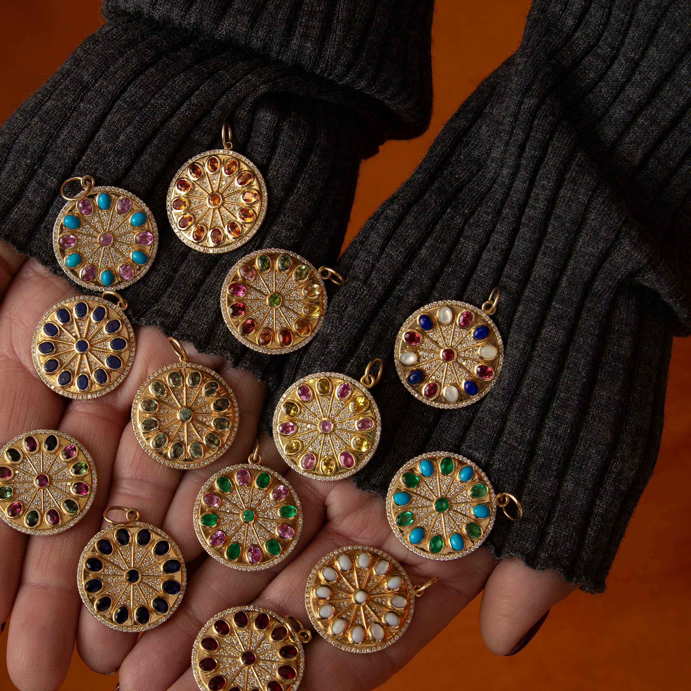 A gold amulet charm featuring a geometric pattern with red garnet, blue lapis lazuli, and mother of pearl inlays, adorned with small round diamonds.