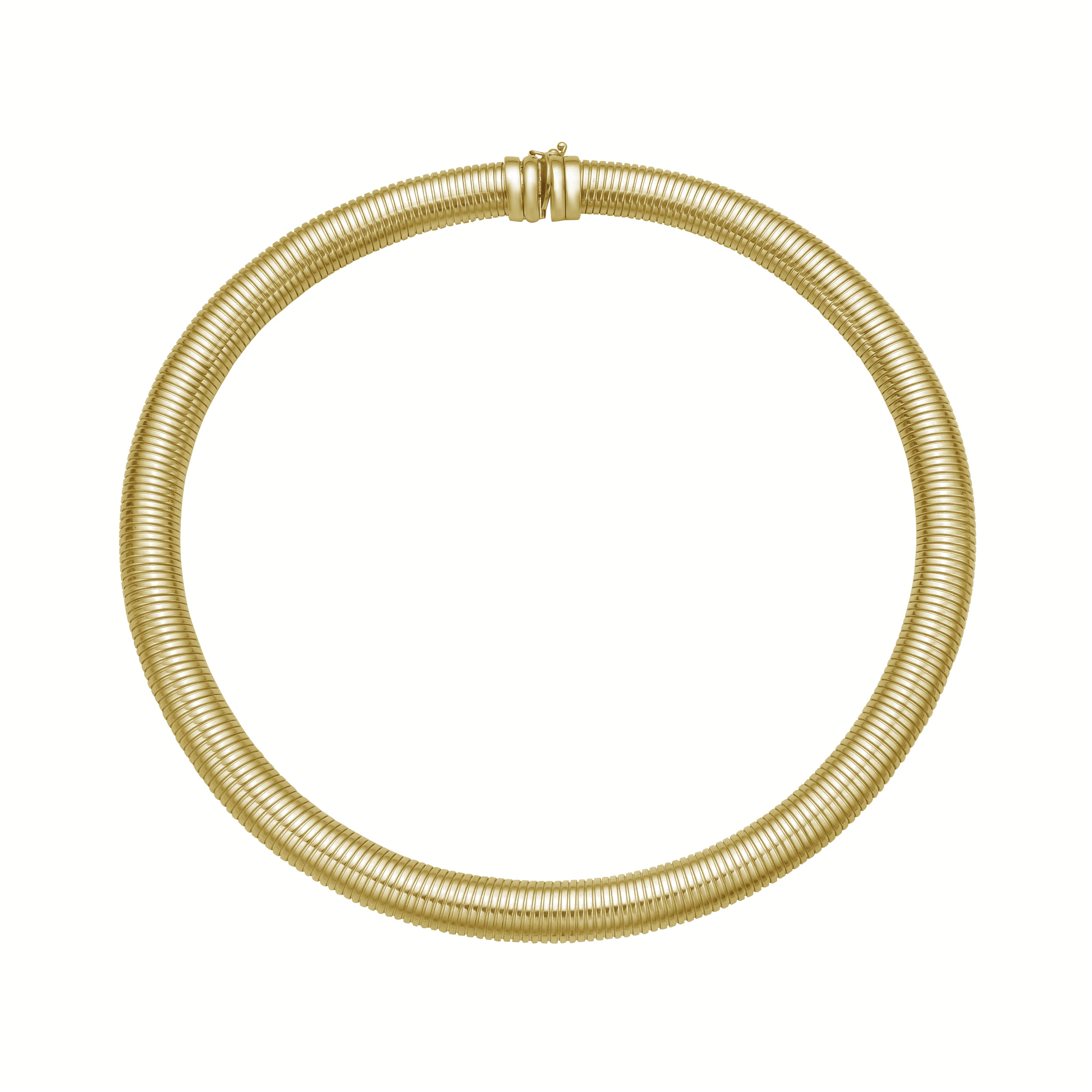 Our Tubogas Chain is a masterpiece of Italian craftsmanship, inspired by the iconic gas pipe design that gives it its name—tubogas, meaning “gas tube” in Italian. This seamless, flexible construction is achieved through an intricate technique of interlocking gold strips, creating a bold yet lightweight silhouette that drapes effortlessly around the neck. A tribute to vintage glamour, reimagined with modern elegance, this piece embodies the artistry and innovation of fine Italian jewelry.