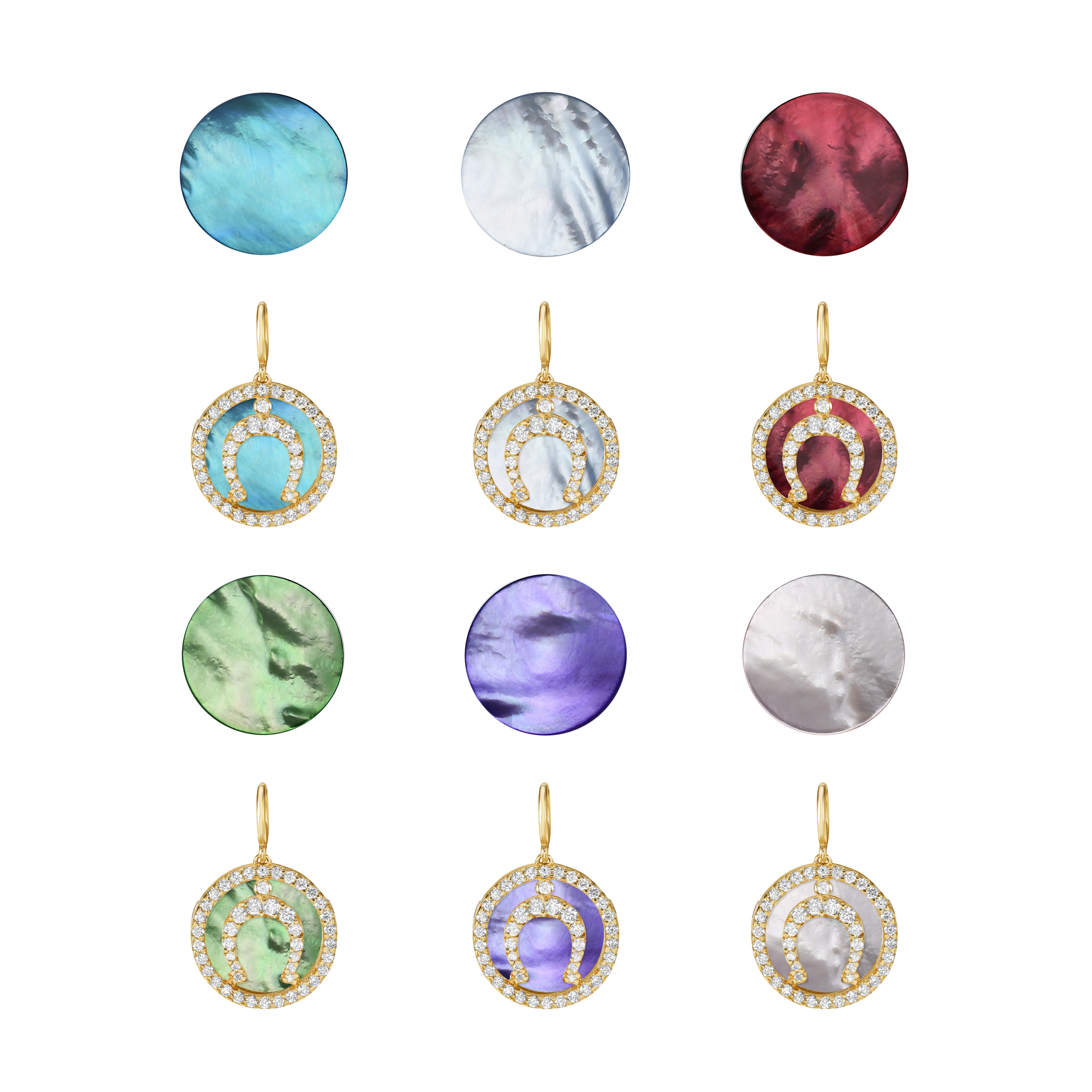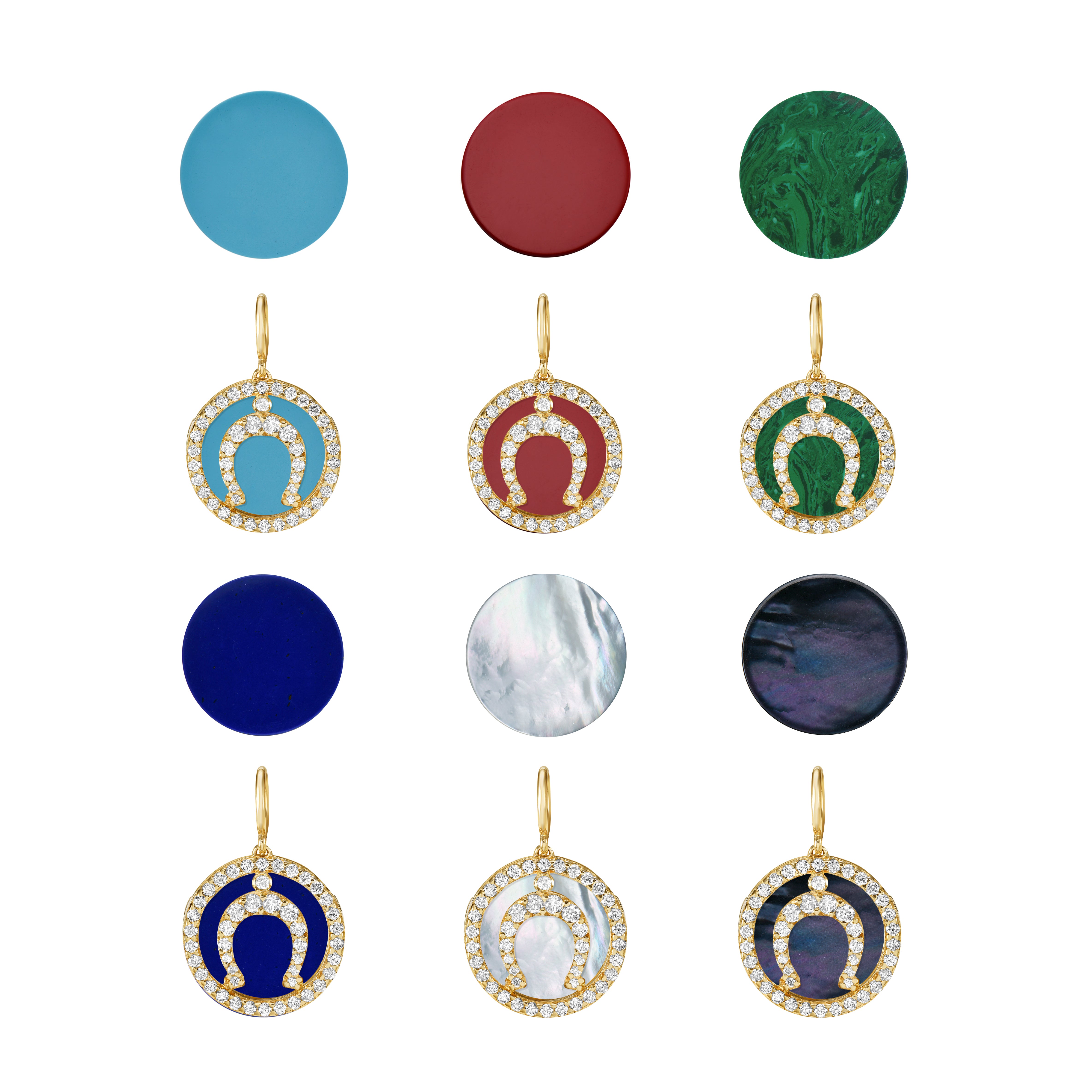 • The Horseshoe charm comes with 12 different swappable gemstones, allowing for personalized expression: Lapis Lazuli, Turquoise, Red Coral Paste, Malachite, and Black Mother of Pearl, Mother of Pearl, (Dyed) Blue Mother of Pearl, Teal Mother of Pearl, Purple Mother of Pearl, Red Mother of Pearl, Pink Mother of Pearl, Green Mother of Pearl