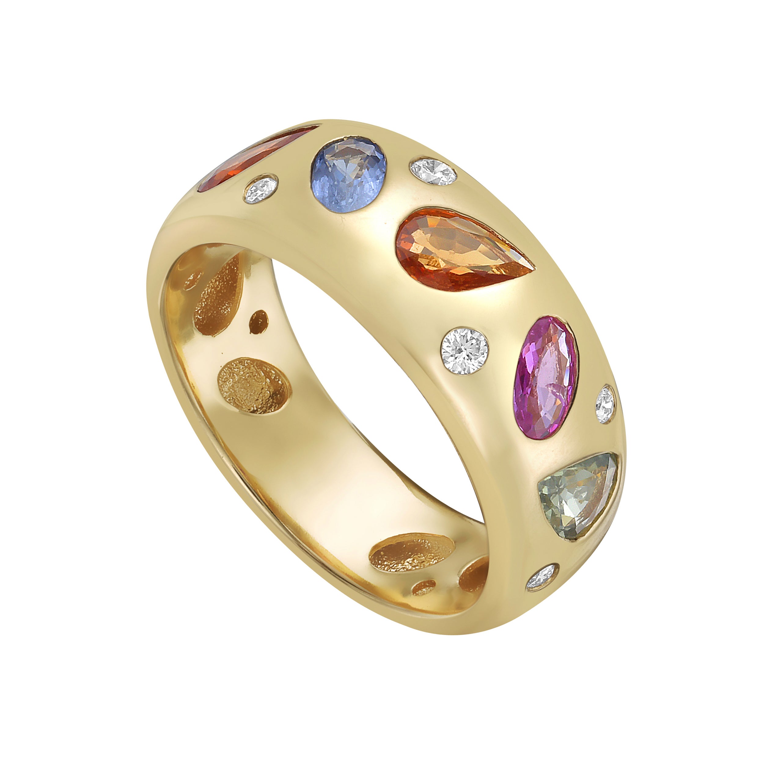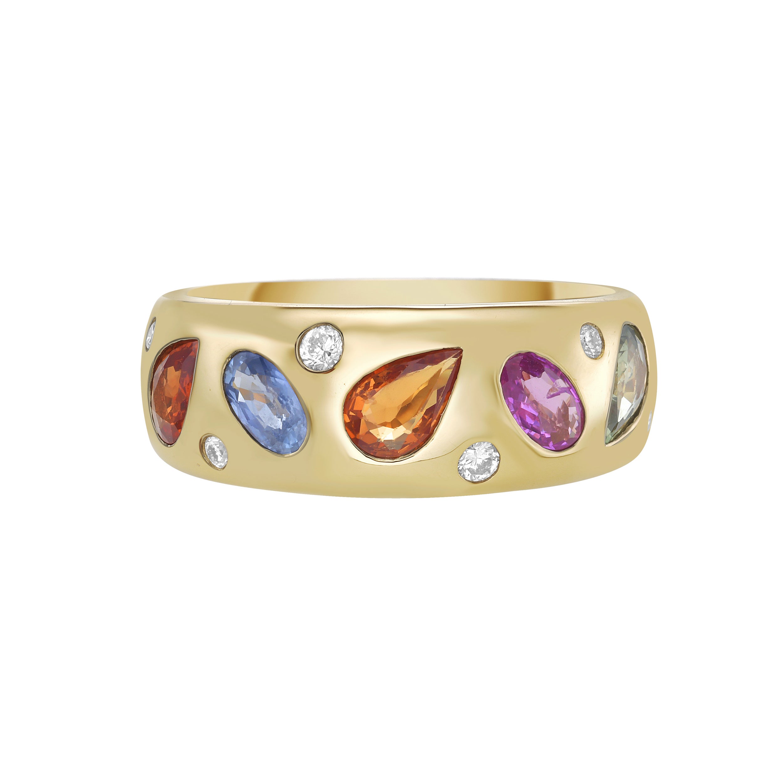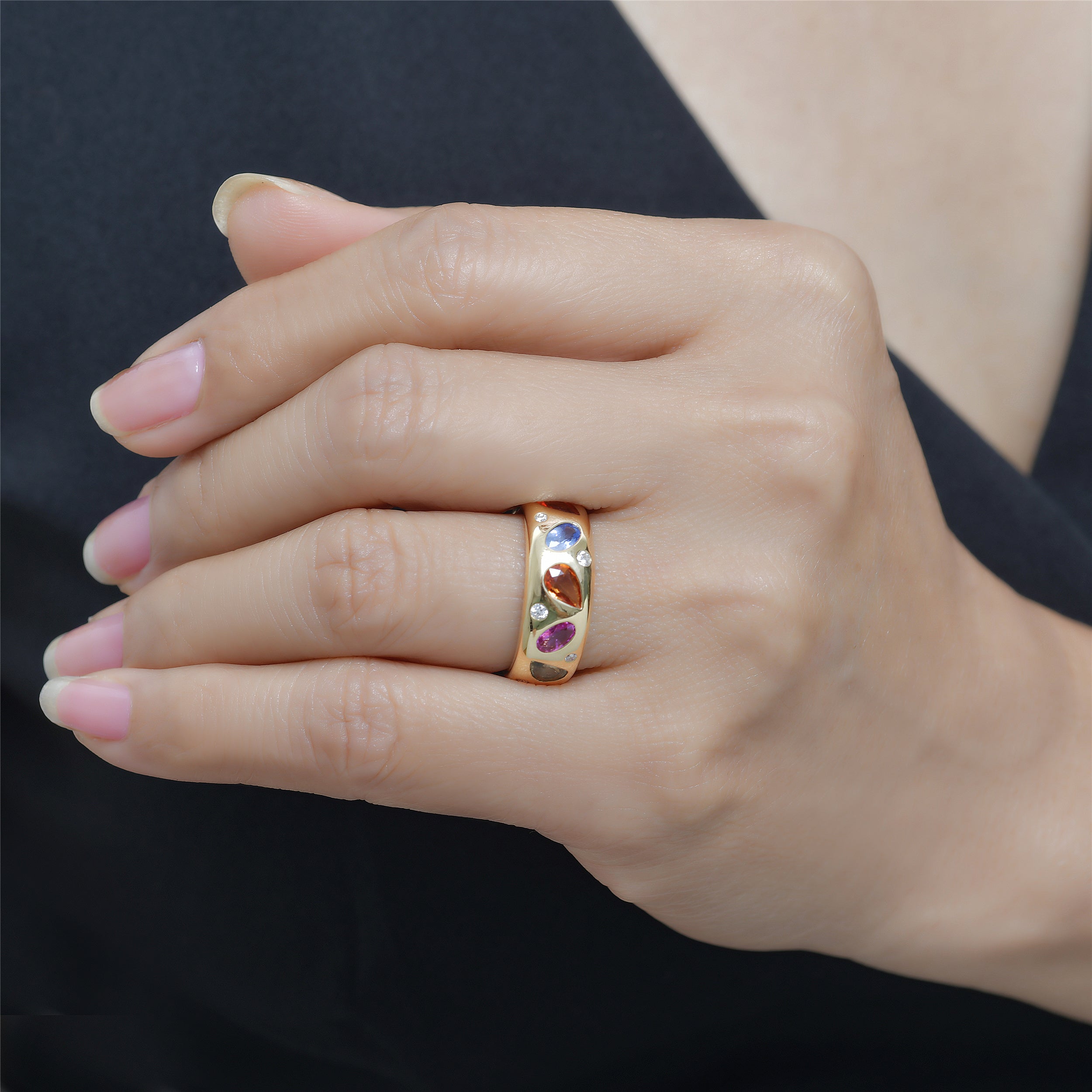 • The stones are arranged in deep orange, blue, deep orange, pink, and green, with each tourmaline showcasing its unique, natural hue.